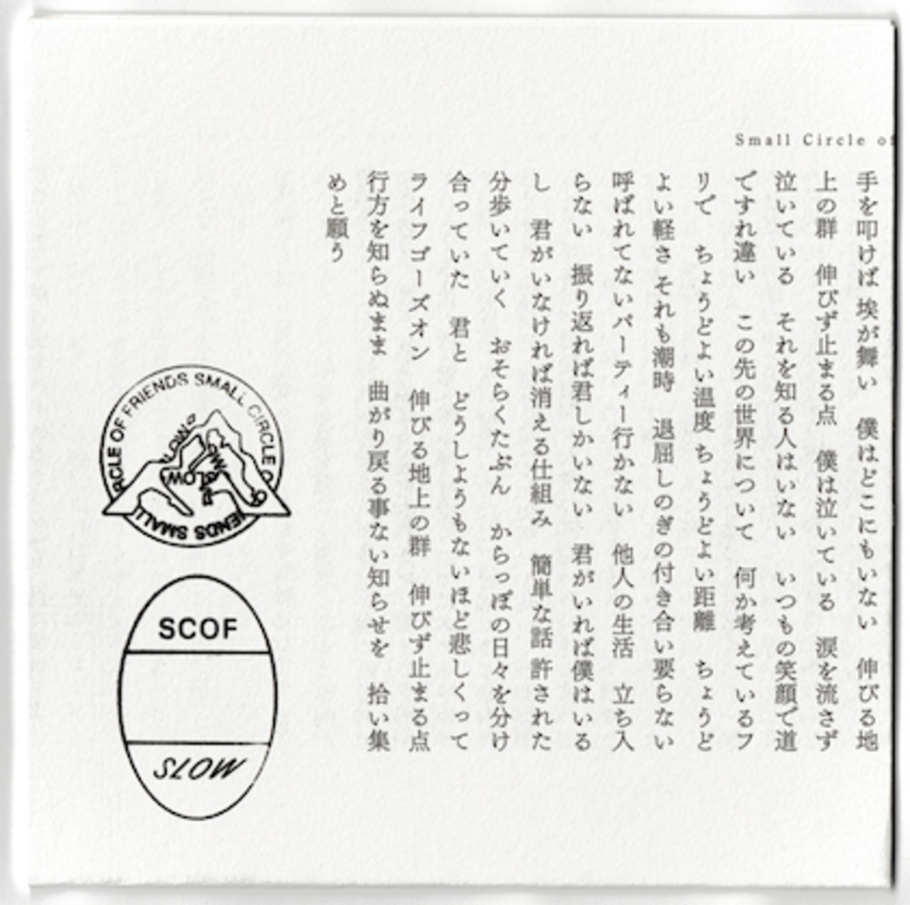 思えば Small Circle of Friends 史上、もっとも”今の世界”を意識したアルバムなのかもしれない。タイトル『SLOW』に込められた意味は、今まで以上にじっくりゆっくり考え考え時間を掛けて作ったアルバムであるということ。